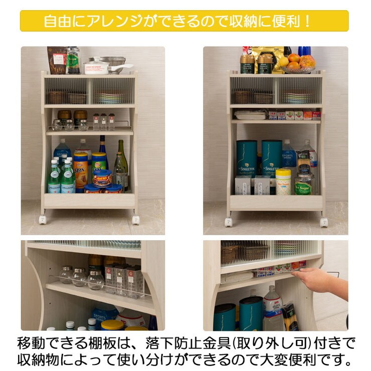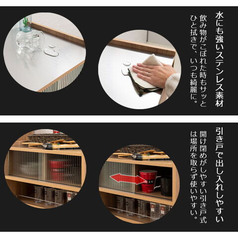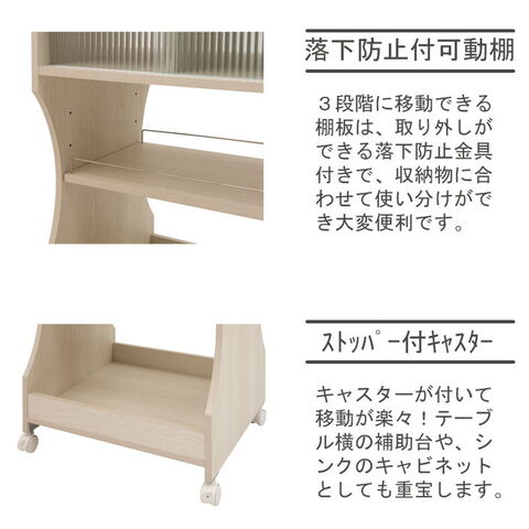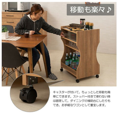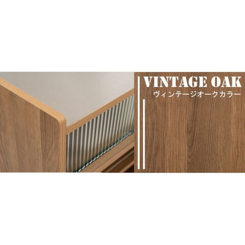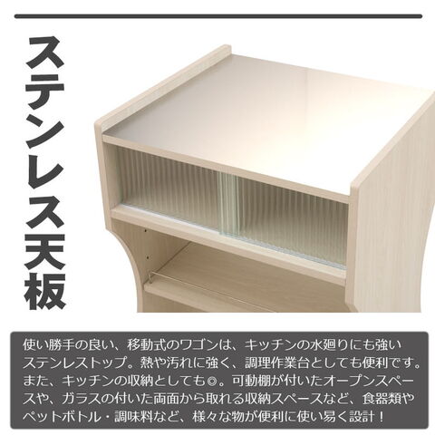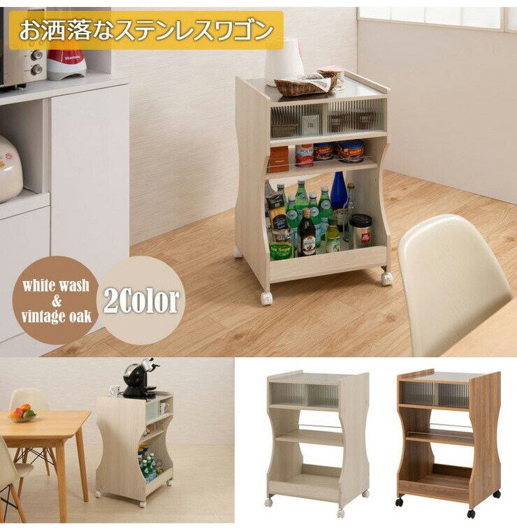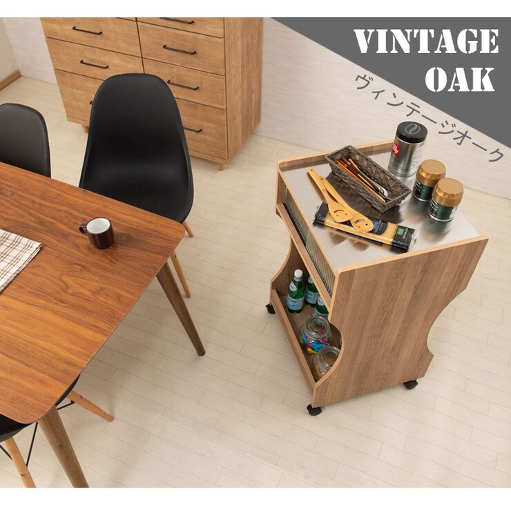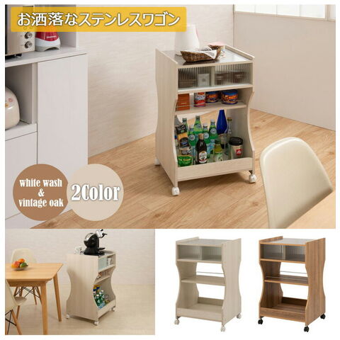 ■商品について/ステンレス天板に仕上げたキッチンワゴンはオープンタイプで使いやすく移動もラクラク。うっすらと木目が見えるホワイトウォッシュカラーと深みのある木目が特徴的なヴィンテージカラーのヴィンテージオーク色の2カラー展開。両面から使える引き戸ガラスがクールな印象。ストックのミネラルウォーターや乾麺など大量収納可能なストッカーとしてもGOOD!