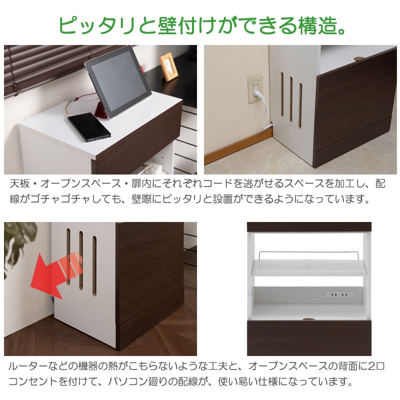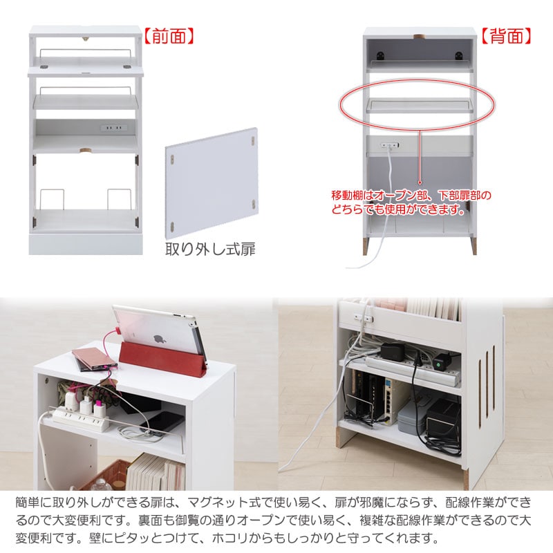 背面はオープン式で、電源タップからの配線処理をスムーズに行え、機器と連携して使えます。