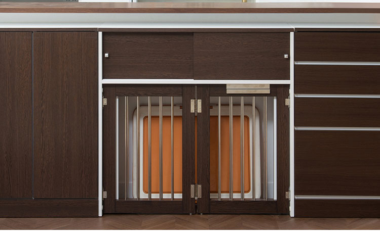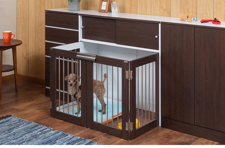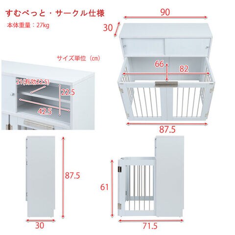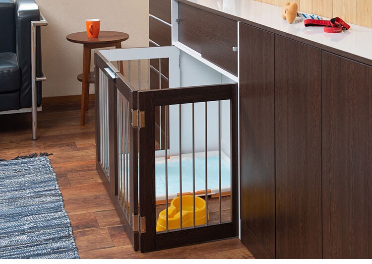 インテリア性も兼ねたペット家具「すむぺっと」×「FACE・NEAT・CALM」のスペシャルコラボ。収納も付いたドッグサークルは、愛犬をサークルに入れるときだけ広げるので、普段は収納キャビネットのように使えるのが魅力!本体の奥行は約30cmでカウンター下や窓下に置いても邪魔にならないサイズ感が使いやすさの秘密です。