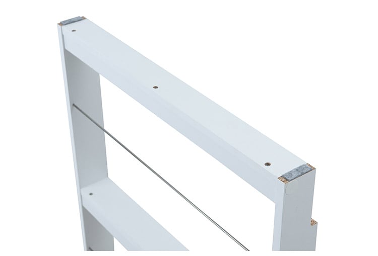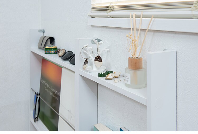 巾木よけ加工をしているので、壁にピッタリ設置ができる超薄型スリッパラック。上段の棚には、芳香剤や観葉植物、鍵などを置くスペースとして。1段にスリッパを3足収納できます。薄型で邪魔にならないのが魅力です。
