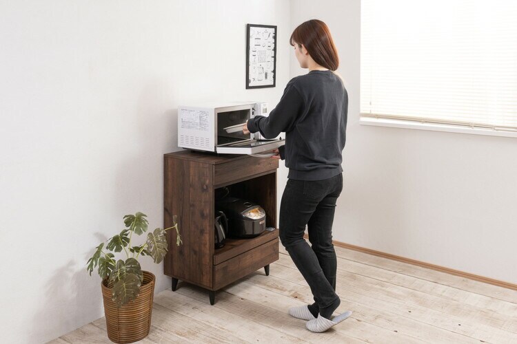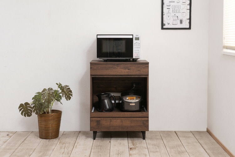 様々なキッチンアイテムを収納できる大小合計2杯の引出し収納付き。上下に2杯ある引出しには、小物などのアイテムが収納できます。カトラリーやラップ、食品ストックなども収納可能。