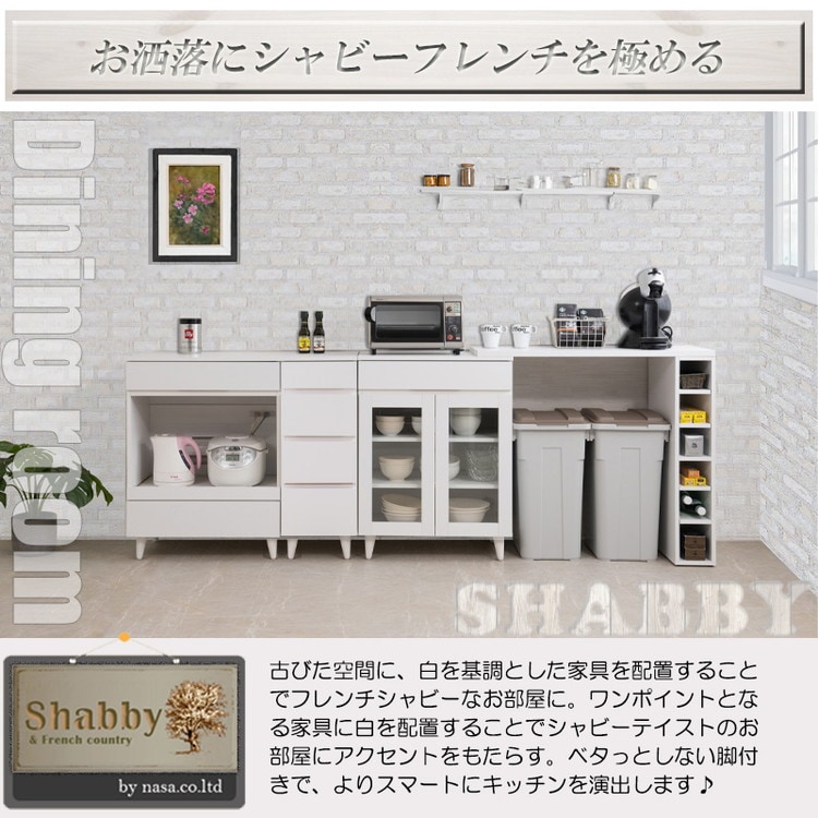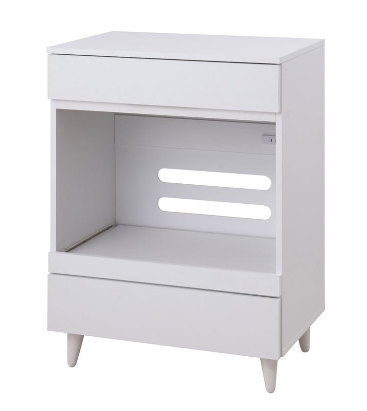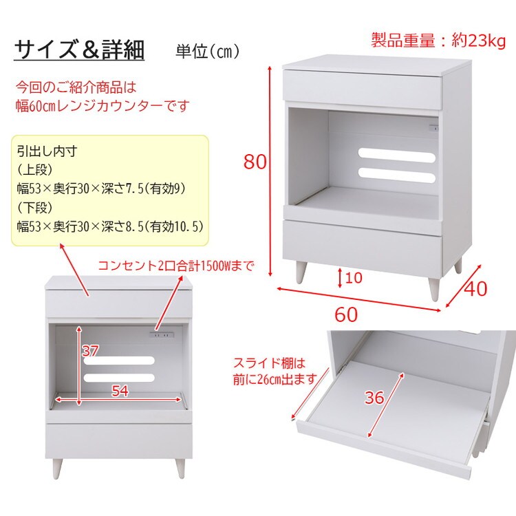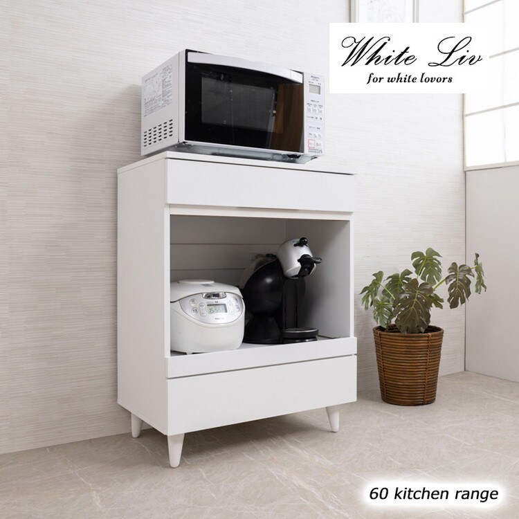 明るいホワイトをベースに、美脚効果で軽やかでスタイリッシュなデザインに仕上げたレンジカウンター。オープンスペースにはスライドする棚板が付いて、家電製品を使うのに便利です。
