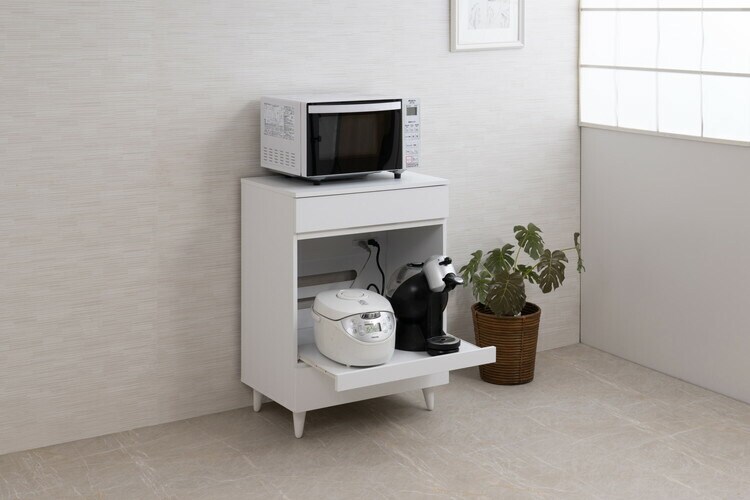 炊飯器やポットなど蒸気の出るものは、前に出して蒸気を逃がすことができます。様々なキッチンアイテムを収納できる大小合計2杯の引出し収納付き。上下に2杯ある引出しには、小物などのアイテムが収納できます。
