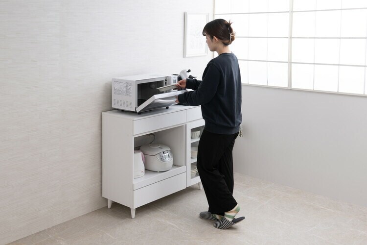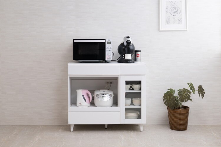 明るいホワイトをベースに、美脚効果で軽やかでスタイリッシュなデザインに仕上げたレンジカウンター。オープンスペースにはスライドする棚板が付いて、家電製品を使うのに便利です。