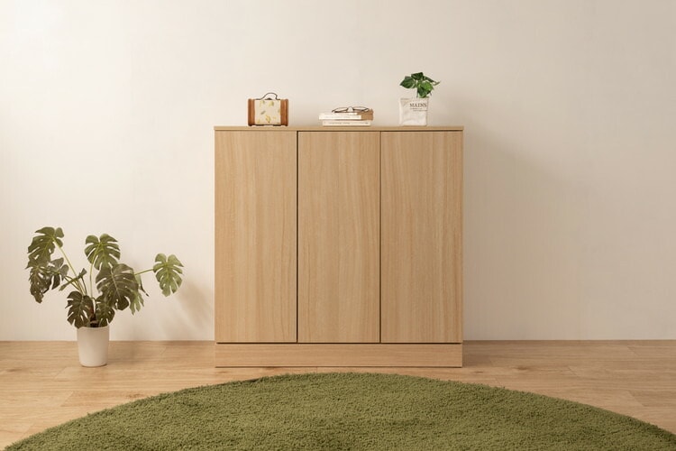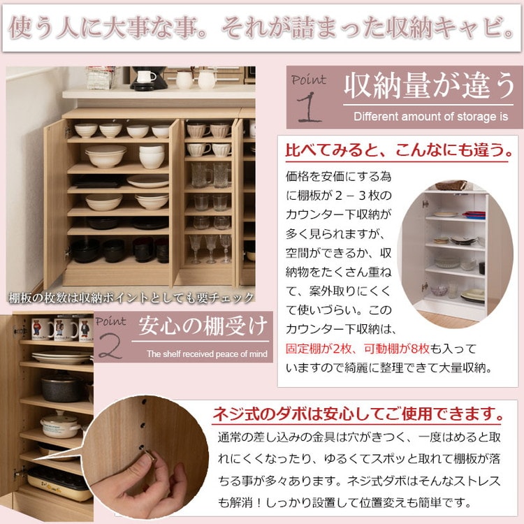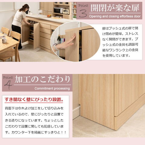リビング・キッチン・寝室・子供部屋がさわやかな木の温かみを感じられる空間に。カウンター下のデッドスペースを造り付けの様なスッキリした収納庫で大量収納。引出しタイプと幅の3種類ある扉タイプでカウンター下のスペースと収納物に合わせてお選び頂けます。