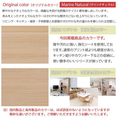 上品な木目が大人気。キッチンや、カウンター下の収納としてリニューアルされた【MARINE】マリンシリーズ。鮮やかなナチュラルカラーは、綺麗な木目が北欧テイスト感を醸し出しています。
