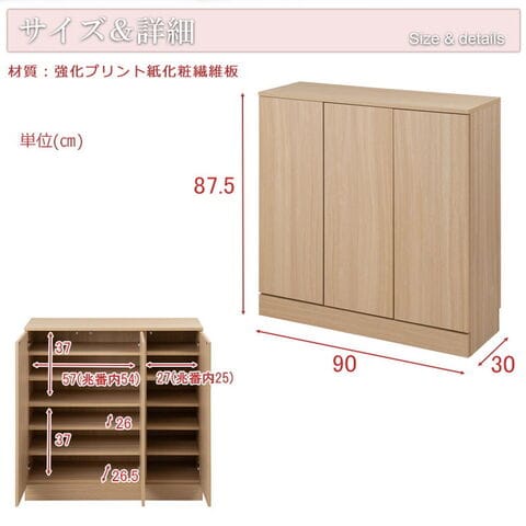扉内寸:(約)幅(左)57(兆番内54)(右)27(兆番内25)×奥行26.5(棚板26)×高さ37(固定棚挟み上下共通)cm