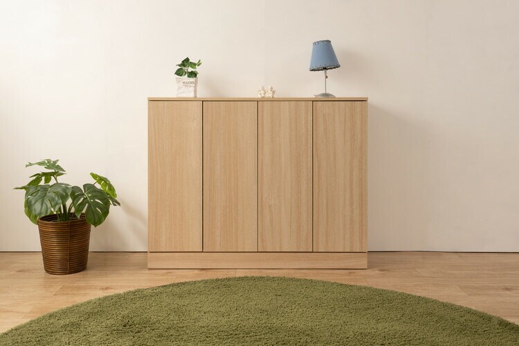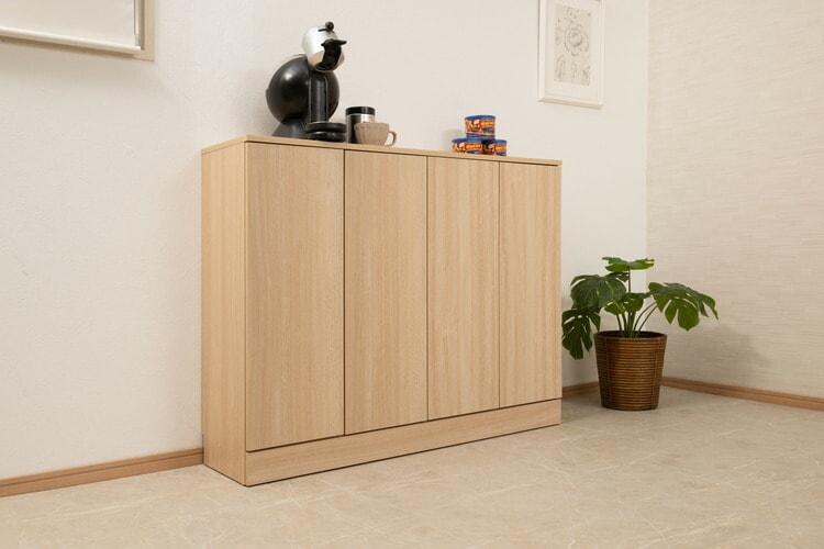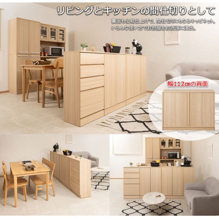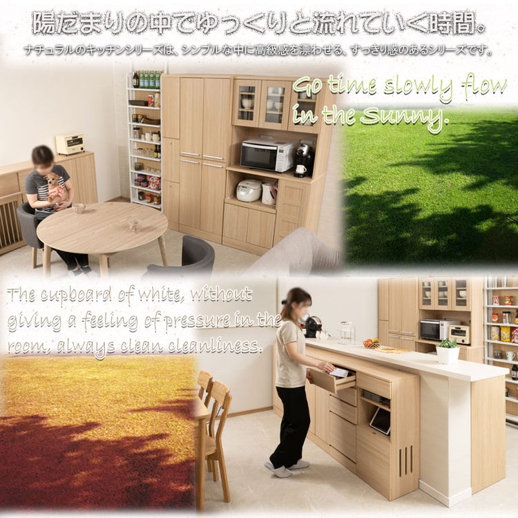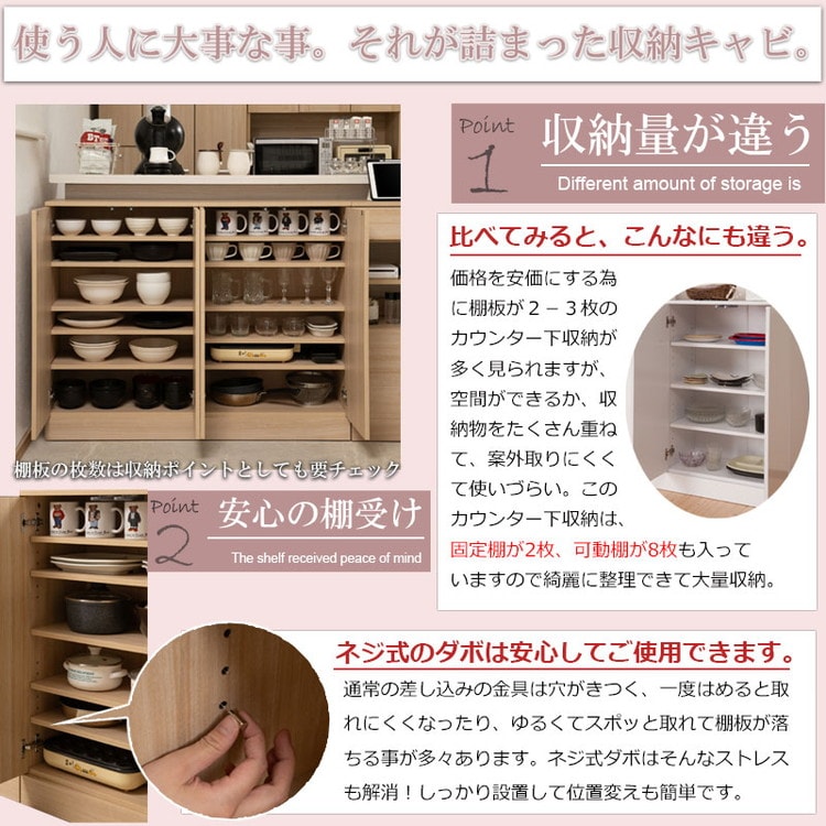 リビング・キッチン・寝室・子供部屋がさわやかな木の温かみを感じられる空間に。カウンター下のデッドスペースを造り付けの様なスッキリした収納庫で大量収納。引出しタイプと幅の3種類ある扉タイプでカウンター下のスペースと収納物に合わせてお選び頂けます。