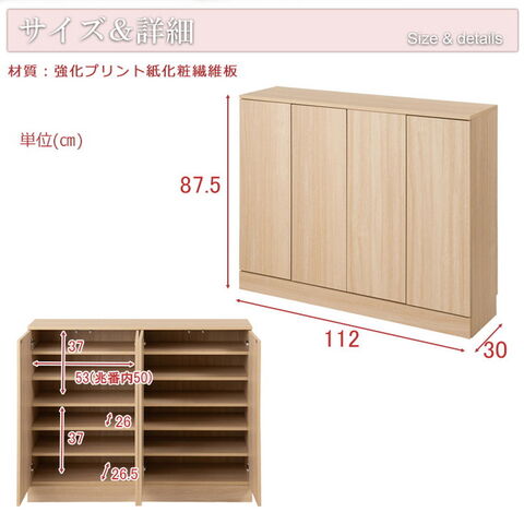 扉内寸(左右共通):(約)幅53(兆番内50)×奥行26.5(棚板26)×高さ37(固定棚挟み上下共通)cm