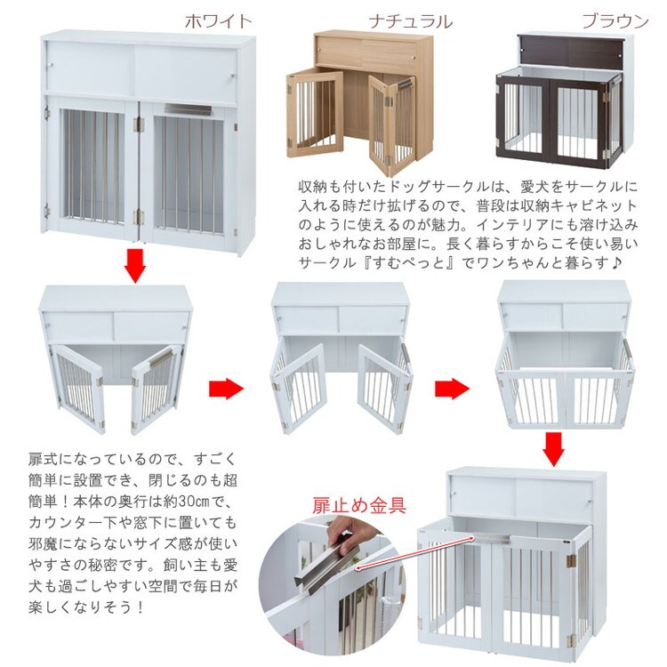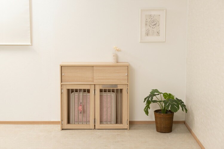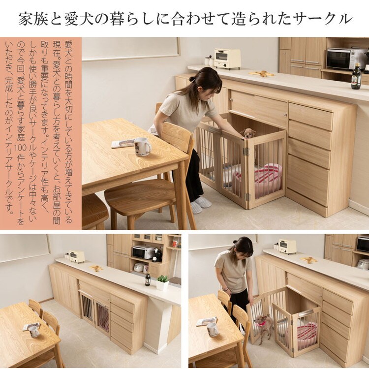 収納も付いたドッグサークルは、愛犬をサークルに入れるときだけ広げるので、普段は収納キャビネットのように使えるのが魅力!本体の奥行は約30cmでカウンター下や窓下に置いても邪魔にならないサイズ感が使いやすさの秘密です。