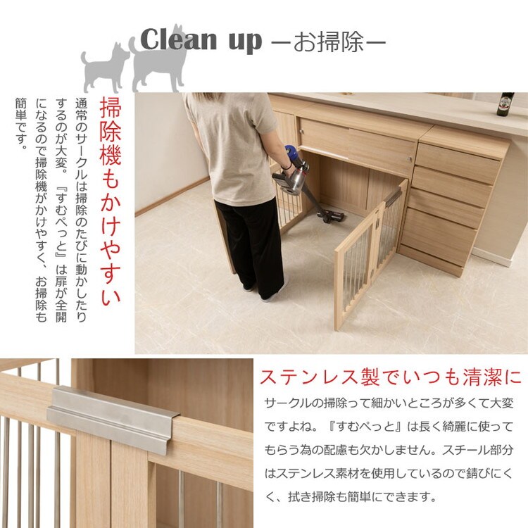 長く暮らすからこそ使い易くお洒落なサークルが◎他のシリーズと合わせて、ダイニングやリビングなどでお洒落に収納できます。ケージ柵はステンレス製でお手入れもしやすい。開放感ある扉式でお掃除も楽々。