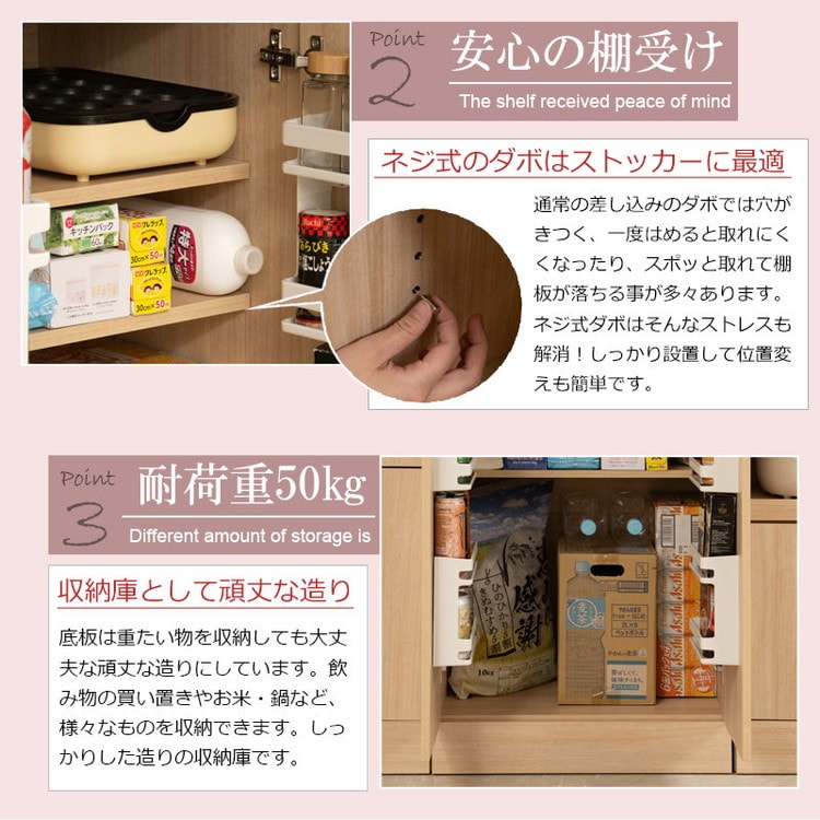 品質にもこだわり、棚板を支えるダボにはネジ式ダボを採用。通常の差し込みのダボでは穴がきつく、一度はめると取れにくくなったり、スポッと取れて棚板が落ちる事が多々あります。ネジ式ダボはそんなストレスも解消!しっかり設置して位置変えも簡単です。