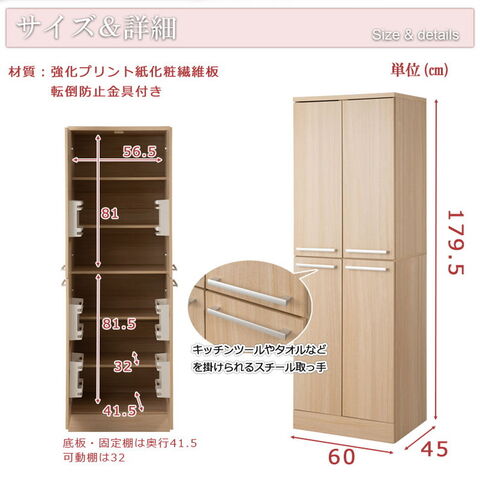 扉内寸:(約)幅56.5×奥行41.5(可動棚32)×高さ(上段81・下段81.5)cm
