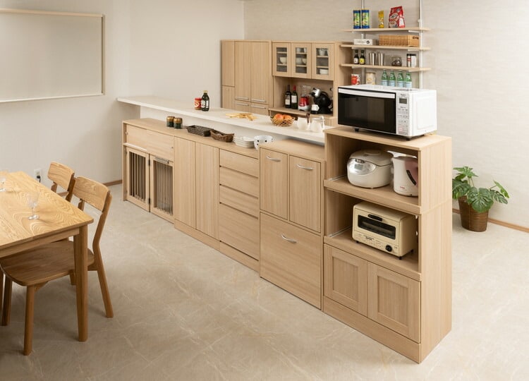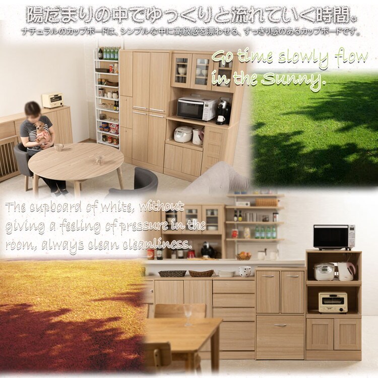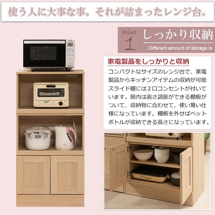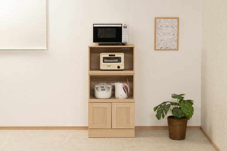 家電製品からキッチンアイテムをしっかり収納できるコンパクトなサイズのレンジ台です。扉内は、移動できる棚板があるので、収納物に合わせて棚板を移動できます。棚板を外すとペットボトルを収納できる高さになります。