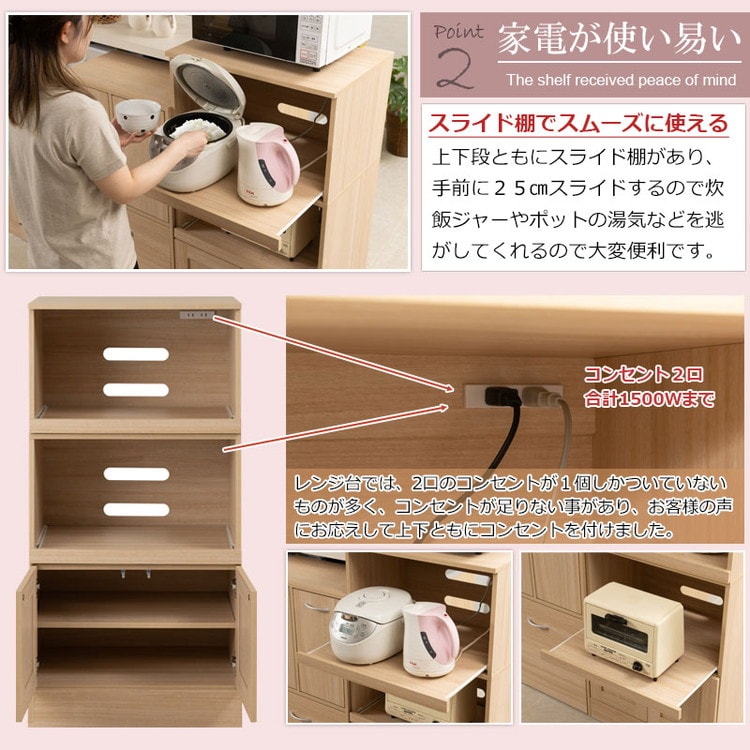 レンジ台では、2口コンセントが1つしかついていないものが多ですが、お客様のお声にお答えして上下の2箇所にコンセントをつけました。