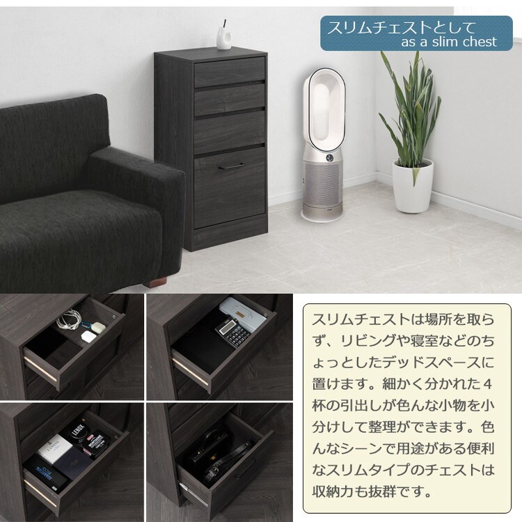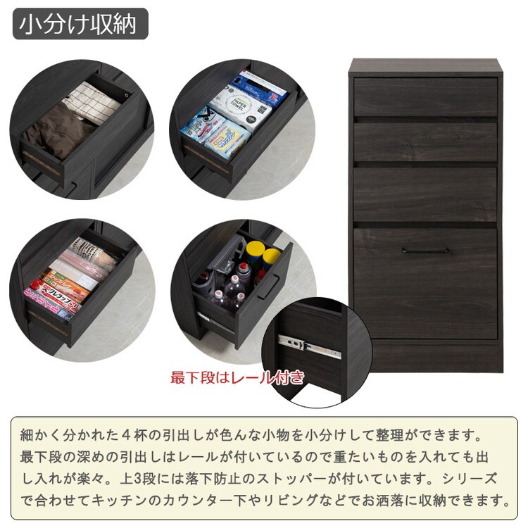 最下段の深めの引出しはレールが付いているので重たいものを入れても出し入れが楽々。上3段には落下防止のストッパーが付いています。シリーズで合わせてキッチンのカウンター下やリビングなどでお洒落に収納できます。