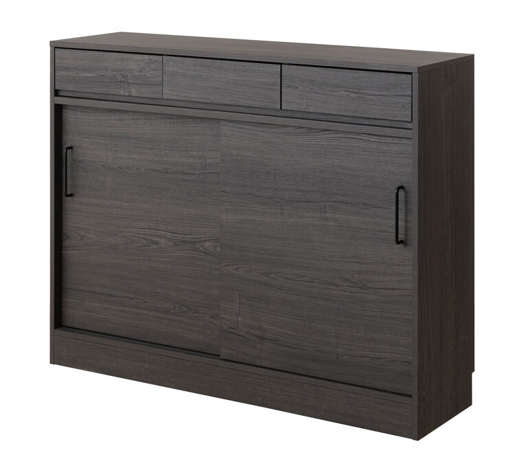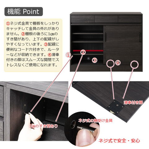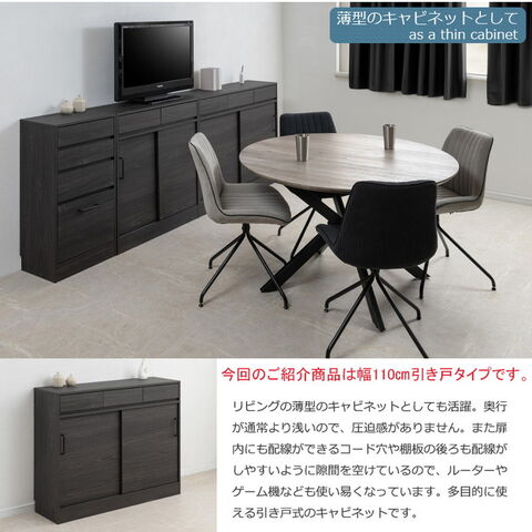 リビングの薄型のキャビネットとしても活躍。奥行が通常より浅いので、圧迫感がありません。また扉内にも配線ができるコード穴や棚板の後ろも配線がしやすいように隙間を空けているので、ルーターやゲーム機なども使い易くなっています。