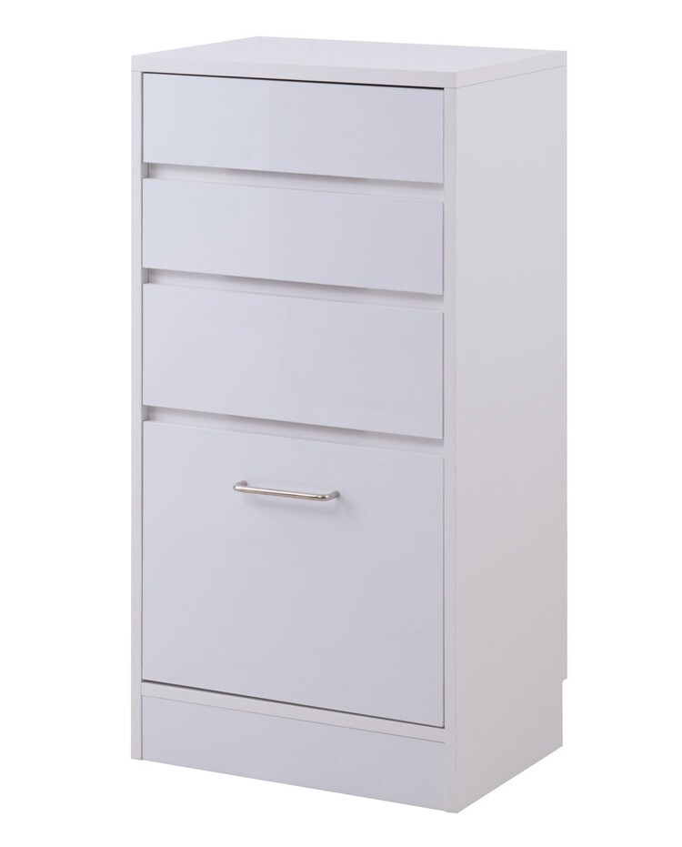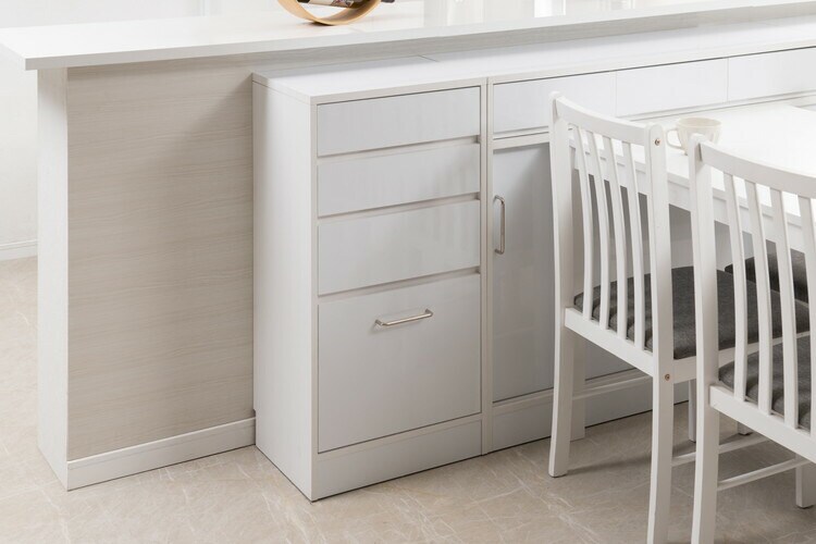 ハイグロス仕上げで高級感ある雰囲気。カウンター下のデッドスペースを造り付けの様なスッキリした収納庫で大量収納。細かく分かれた4杯の引出しが色んな小物を小分けして整理ができます。