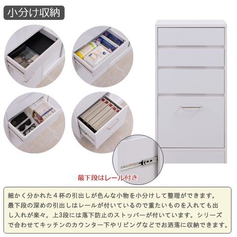 最下段の深めの引出しはレールが付いているので重たいものを入れても出し入れが楽々。上3段には落下防止のストッパーが付いています。シリーズで合わせてキッチンのカウンター下やリビングなどでお洒落に収納できます。