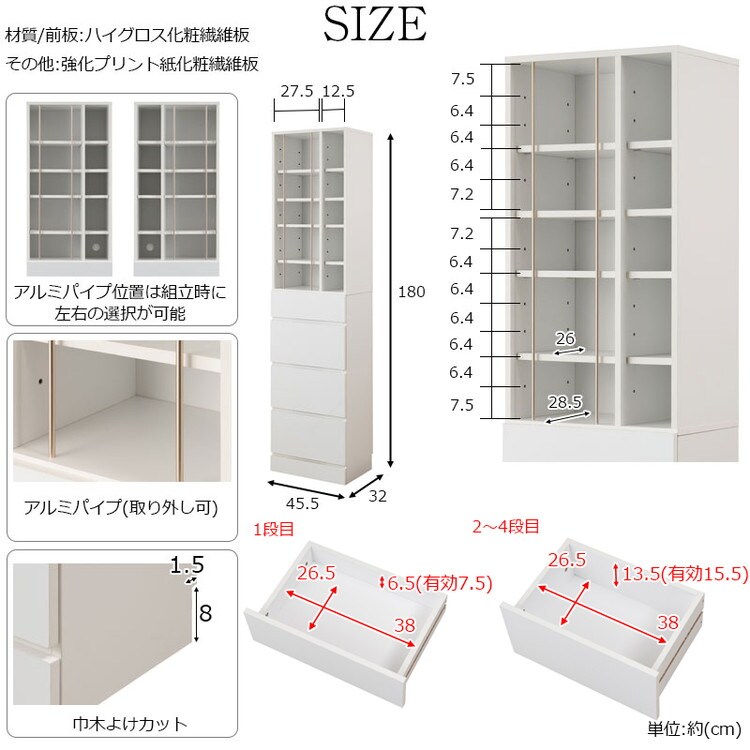 棚板:可動式:6枚(6.4cmピッチ・上:4段階・下:6段階)、固定式:2枚 ※組立時の固定棚の位置選択で上下の棚ピッチ数は反転します。