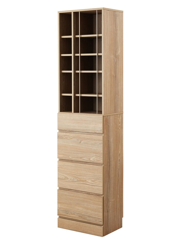 引出しは深さがあるので、パジャマや下着など着替え、おやすみグッズの収納に最適。オープンラック部分は毎日の使用頻度の高いモノや化粧品などディスプレイ効果があるモノを飾ってもよし。