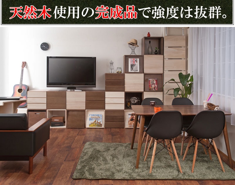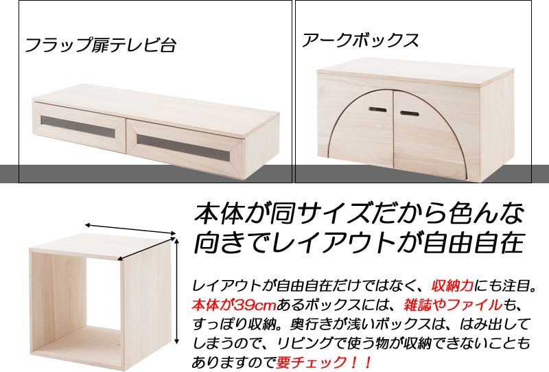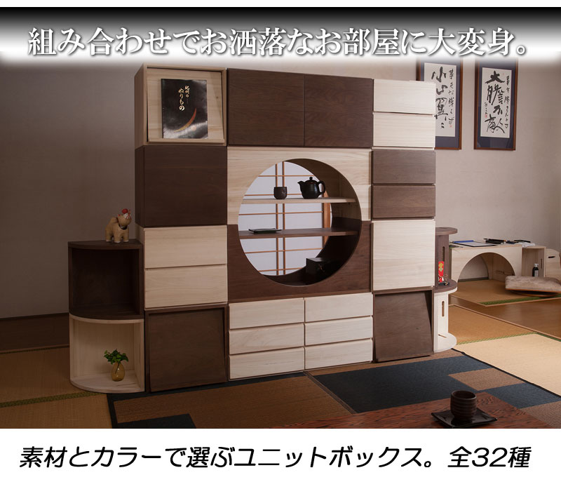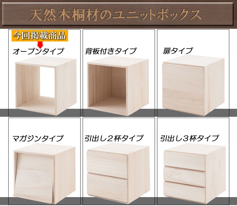 ■商品について/上質で木目の美しい桐材使用のユニットボックスシリーズ。衣類収納などによく使われている桐材を組合わせてテレビボードやキャビネットの他、組合わせ次第で様々な高級家具になり、和の雰囲気で作るのもよし、洋風なイメージで組み合わすなどのお部屋作りができます。キューブタイプのボックスが6種類とテレビ台、デスクやテーブルになるアークボックスの全8タイプに、今回はカラーだけで分けるのではなく色にあった高級材を選別して造りました。ウォールナット材のダークブラウン、メープル材(メイプル材)のライトブラウン、天然木桐材のナチュラル、MDF材に艶出し塗装を施したホワイトの4カラーから選べます。キューブ型にテレビ台やアークボックスを組み合わせる事で今までにないユニットボックスの形が無限大に広がります。