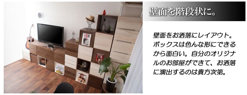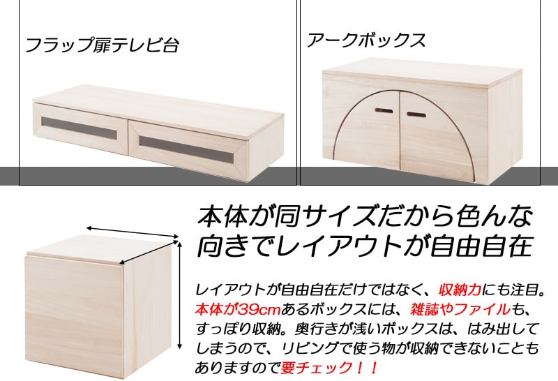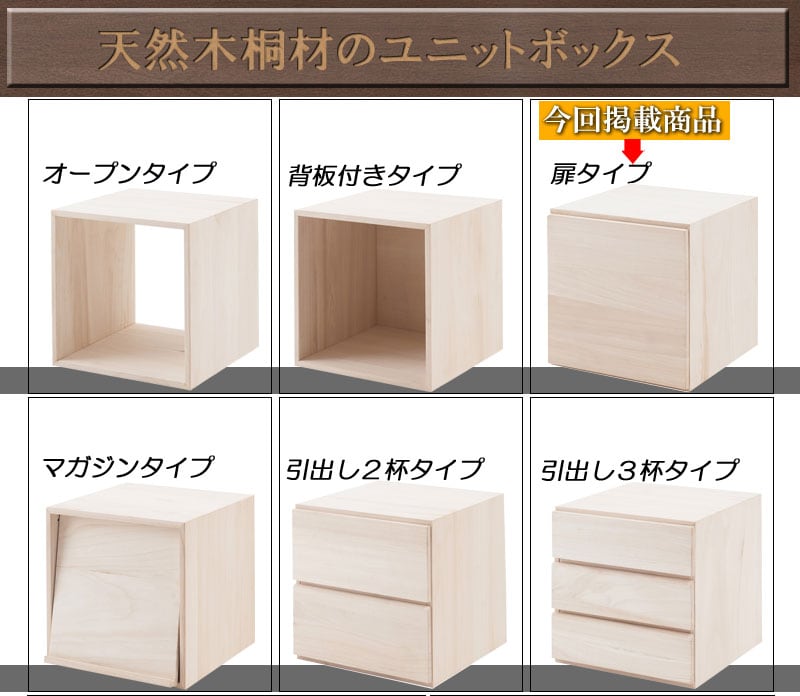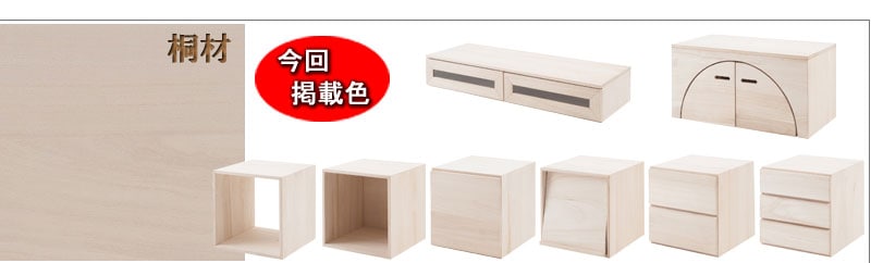■商品について/上質で木目の美しい桐材使用のユニットボックスシリーズ。衣類収納などによく使われている桐材を組合わせてテレビボードやキャビネットの他、組合わせ次第で様々な高級家具になり、和の雰囲気で作るのもよし、洋風なイメージで組み合わすなどのお部屋作りができます。キューブタイプのボックスが6種類とテレビ台、デスクやテーブルになるアークボックスの全8タイプに、今回はカラーだけで分けるのではなく色にあった高級材を選別して造りました。ウォールナット材のダークブラウン、メープル材(メイプル材)のライトブラウン、天然木桐材のナチュラル、MDF材に艶出し塗装を施したホワイトの4カラーから選べます。キューブ型にテレビ台やアークボックスを組み合わせる事で今までにないユニットボックスの形が無限大に広がります。