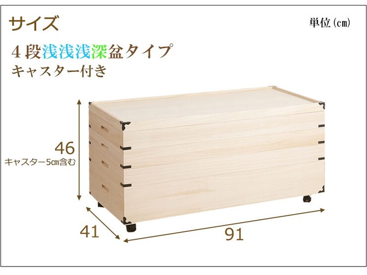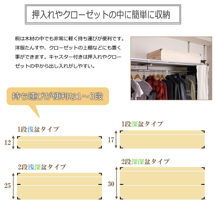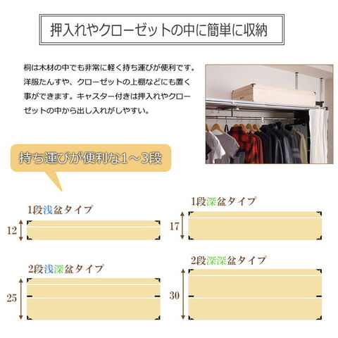 別売りの衣装盆で買い足し積み重ねができるので増える着物と洋服をしっかり収納。