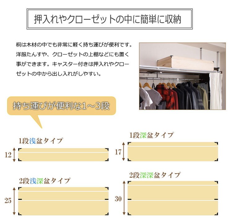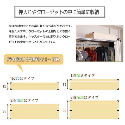 別売りの衣装盆で買い足し積み重ねができるので増える着物と洋服をしっかり収納。