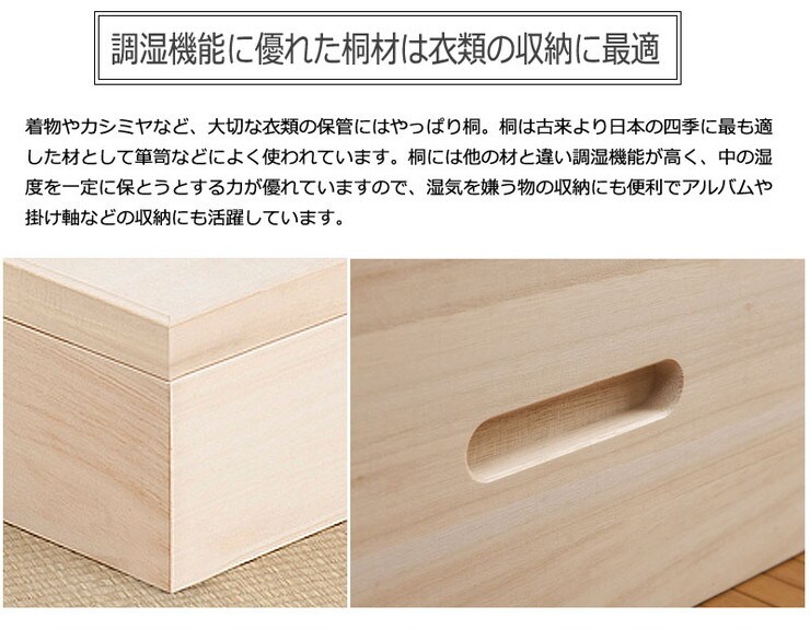 取っ手金物のないシンプルに仕上げたモダンな印象の桐衣装箱。
