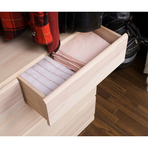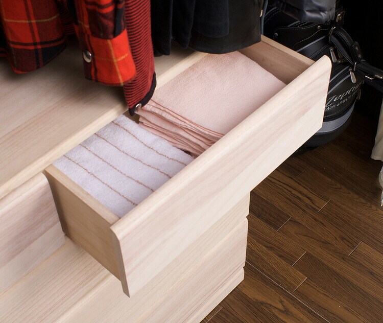 ■商品について/取っ手飾りのないシンプルなデザインの洋風桐箪笥。総桐製で大切な着物屋衣類を守ります。デザインを損なわない隠しキャスター付きで移動も楽なクローゼットチェスト。キャスターは取り付けずの使用も可能です。クローゼットハンガー下におさまる使い勝手のよいサイズ感が人気。三つ折り着物や帯収納に便利な幅76.5cmタイプ、2つ折りたとう紙ごと収納できる幅廣の100.5cmから。