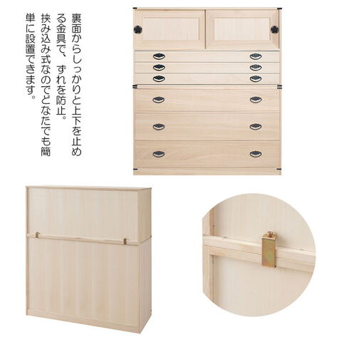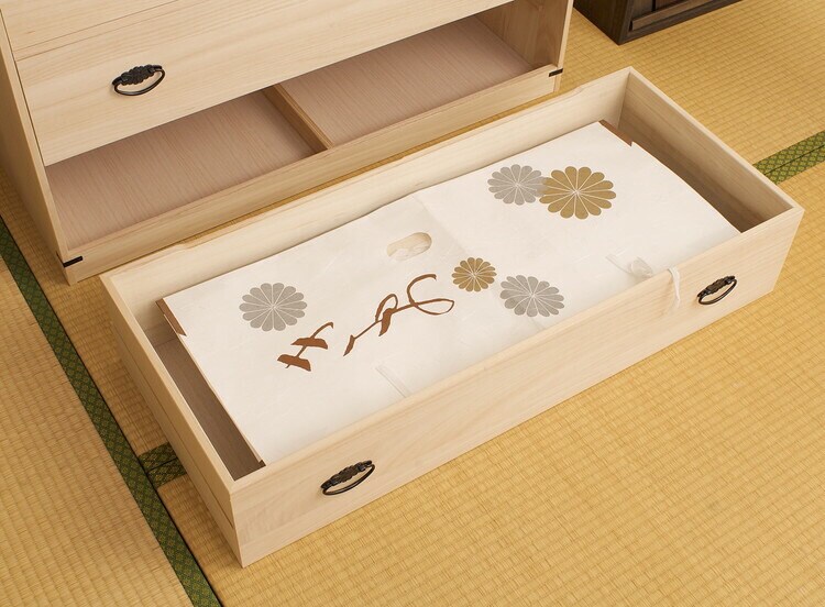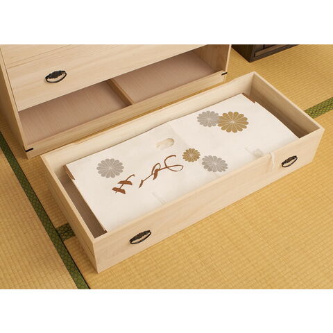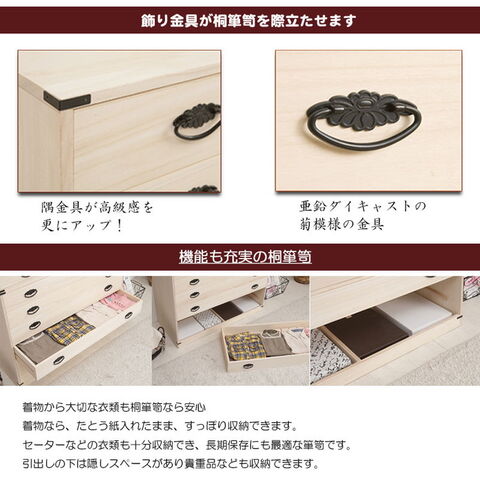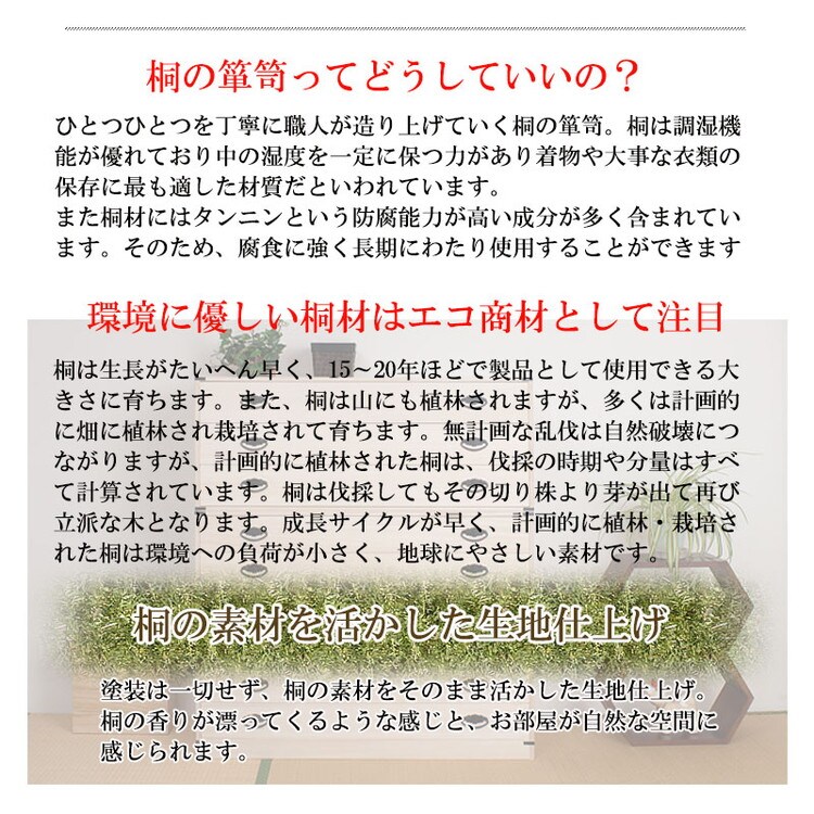 ■商品について/ たとう紙を折らずに収納できる幅広の桐チェスト。桐材は内部を一定の湿度に保とうとする働きがあります。大切な衣類の保管に最適です。家具で有名な九州・大川で生産しており高品質です。