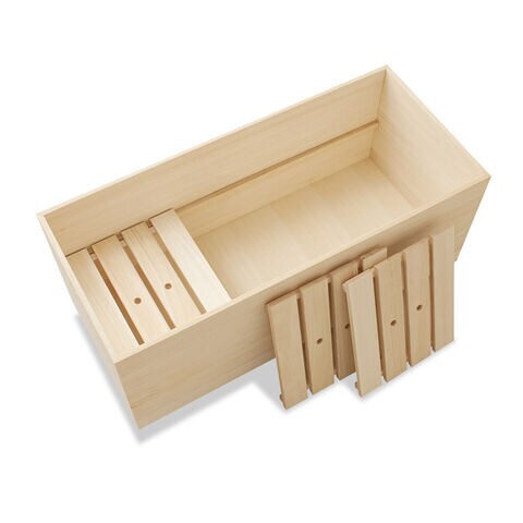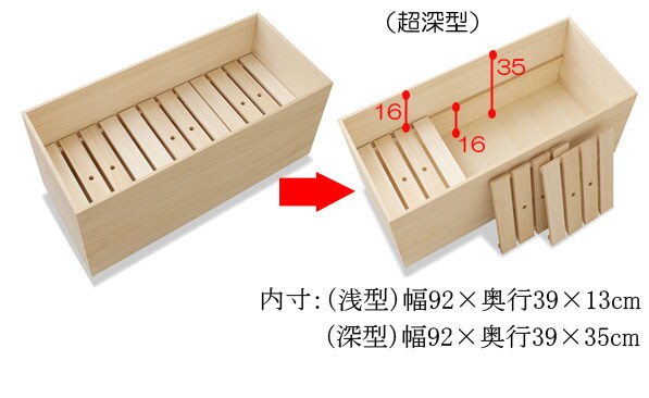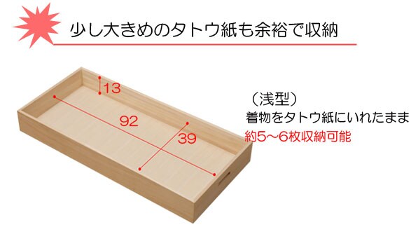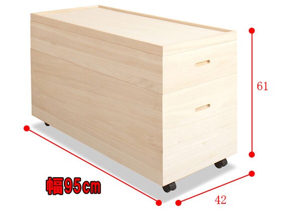 | 本体:(約)幅95×奥行42×高さ61cm(キャスター含むと高さ64cm) 内寸:(約)幅92×奥行39×高さ7cm・2杯 (約)幅92×奥行39×高さ16cm・2杯 主材/本体:天然木(桐材)、天板・底板:天然木桐化粧板 商品重量:10kg キャスター付 日本製 |
