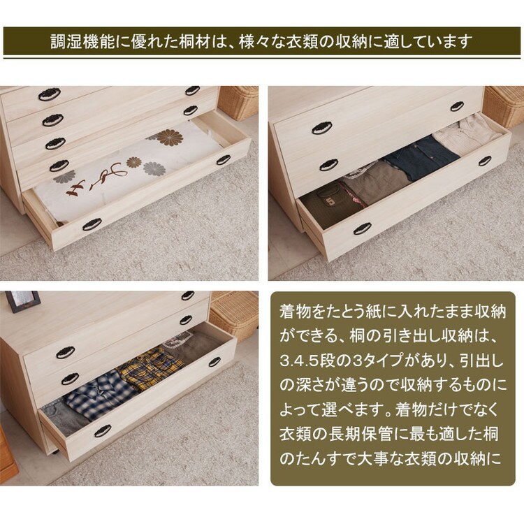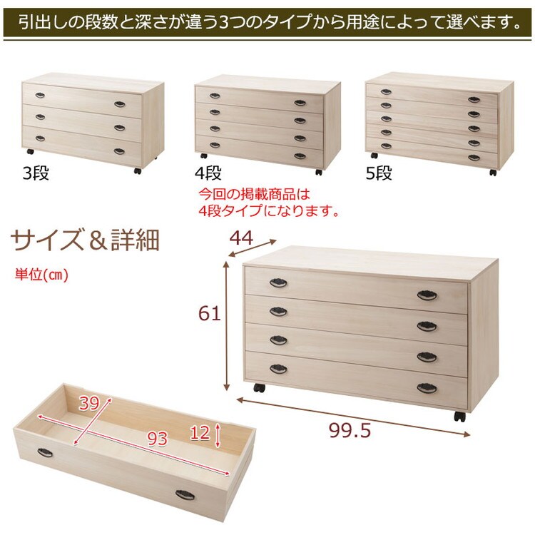 ■商品についてクローゼットにも入る総桐チェスト。お掃除等移動に便利なキャスター付きで3段・4段・5段の3タイプをご用意。