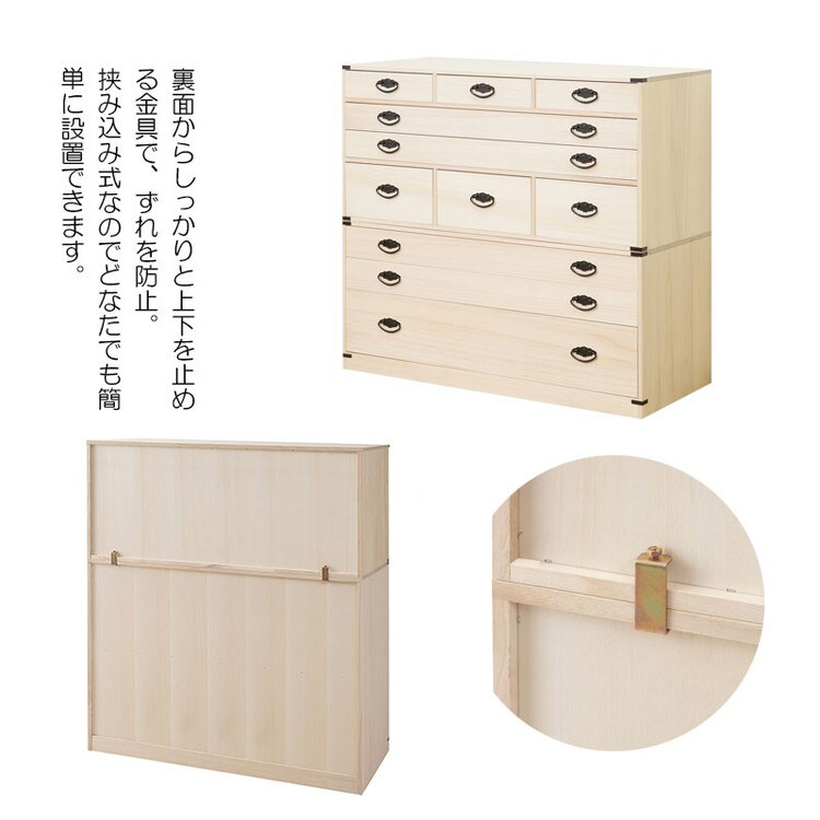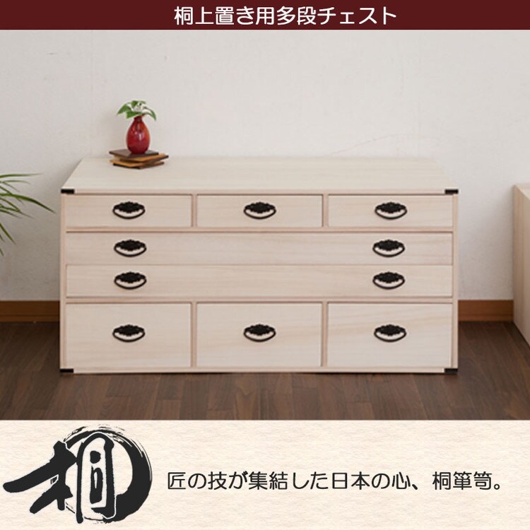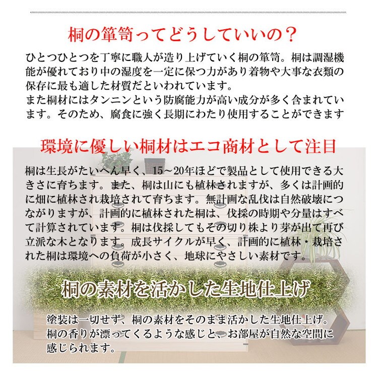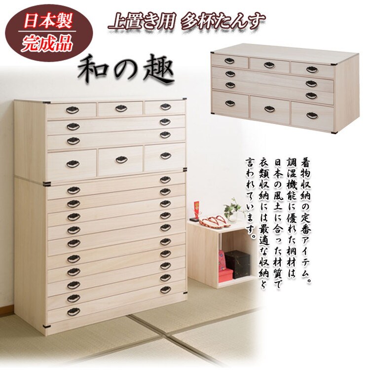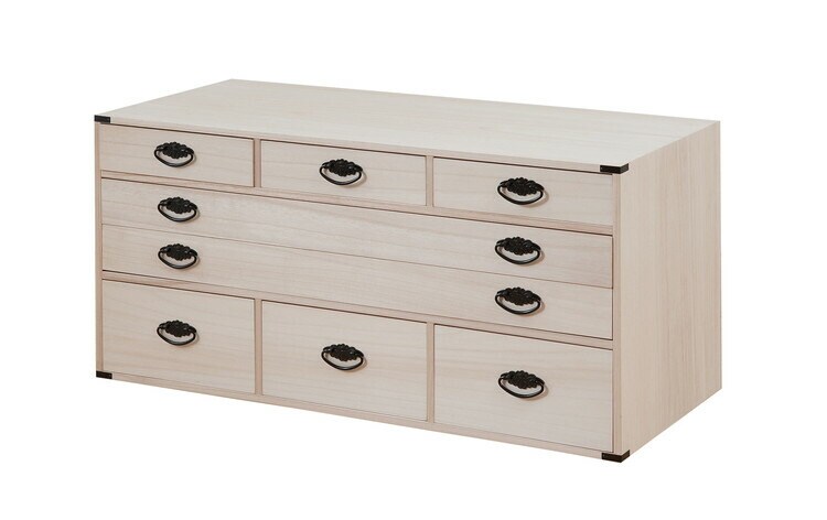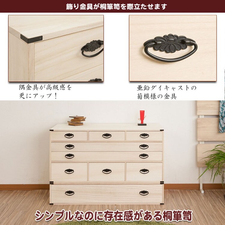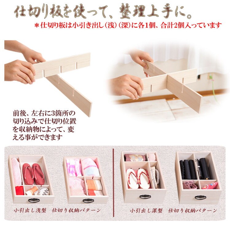■商品について/人気の定番桐タンスシリーズに着物だけでなく和装小物まで収納を一体にした桐箪笥が新登場!今まで着物とは別に収納していた肌襦袢・半衿・髪飾り・足袋・帯留め・帯締め・帯揚げ・履物草履などを一貫してここに収納を実現。小引出しには着物に合わせたお気に入りの小物をセットし、そうすることでその日のコーディネイトがスムーズに楽しく。帯・着物・浴衣は幅広引出しにセットし、浅深6杯の小引出しで計8杯もの仕分けができる収納達人に。単独使いやセット購入又は同シリーズの桐箪笥を既にお持ちの方も重ねて使える万能型。かんざしなどの髪飾りや帯など増え続ける着物達人には絶対おすすめ!何かと日本の四季に不可欠な桐材を使用した桐タンス。世代を超えて引き継ぐ大事な着物の収納は桐で決まり。