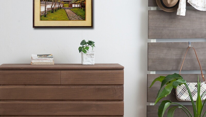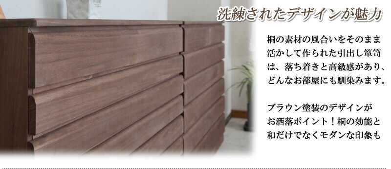 マットな艶のない落ち着きのある水性塗装のデザインがお洒落ポイント!桐の効能と和だけでなくモダンな印象も兼ね備えた桐の箪笥です。