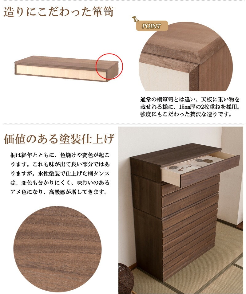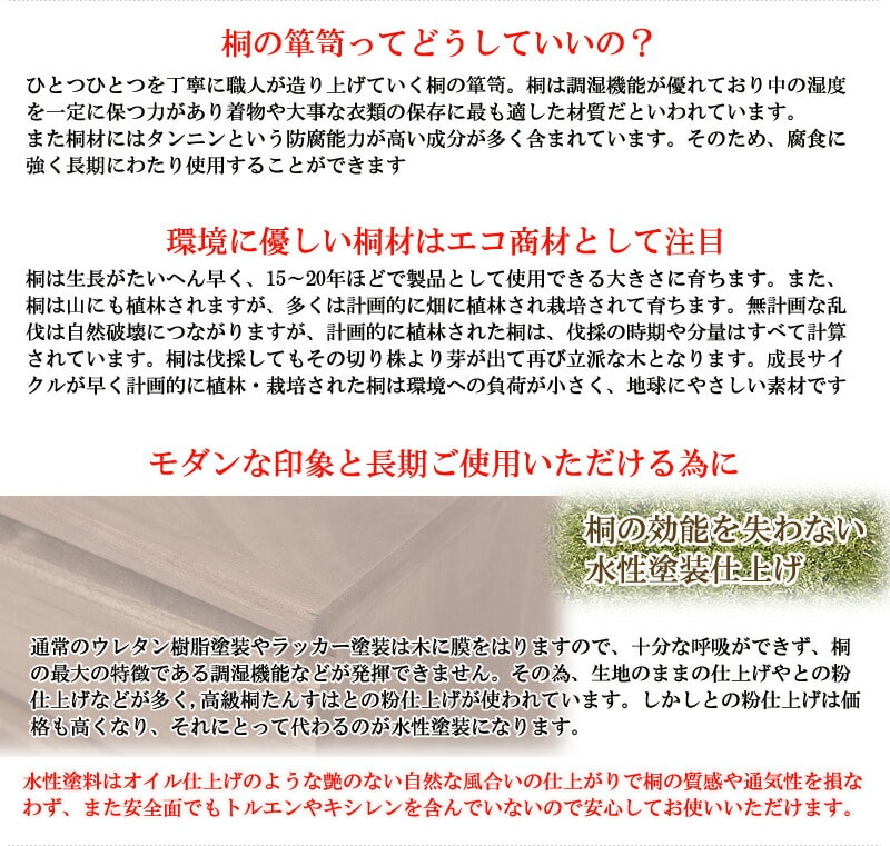 ■商品について/桐の素材の風合いをそのまま活かして作られた引出し箪笥は、落ち着きと高級感があり、どんなお部屋にも馴染みます。