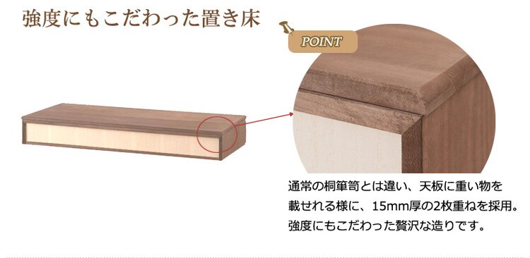 通常の桐箪笥とは違い、天板に重い物を載せれる様に、15mm厚の2枚重ねを採用。強度にもこだわった贅沢な造りです。
