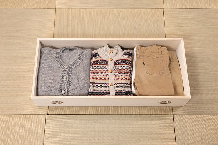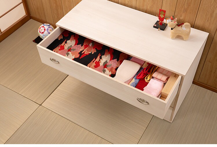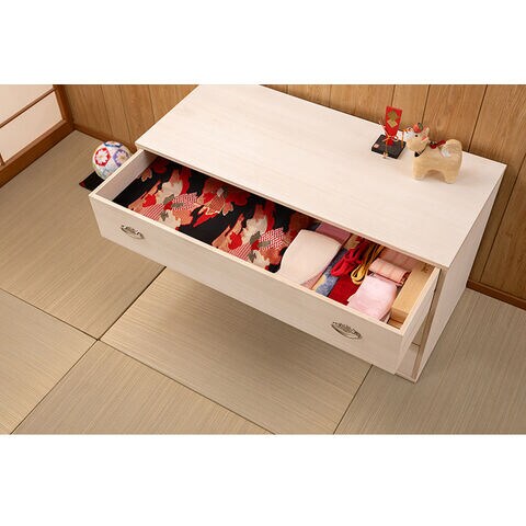 クローゼットや押し入れから出し入れがし易い移動に便利なキャスター付き。動かさない時はストッパーが2個付いていますのでしっかり固定できます。お掃除などの場合でもキャスター付きだと簡単に移動ができて便利です。着物から大切な衣類まで収納するならやっぱり桐。調湿機能に優れた桐材は、日本のように四季がある国では大変重宝されています。日本の伝統的な着物と桐箪笥は、まさに相性が抜群と言える組み合わせです。着物だけではなく、大事な衣類なども合わせて収納ができます。着物をたとう紙に入れたまま保管できるのが桐チェスト。もちろん、セーターや大事な衣類の保管にも。クローゼットや押し入れなどのデッドスペースに収納をプラスして。