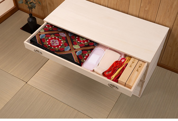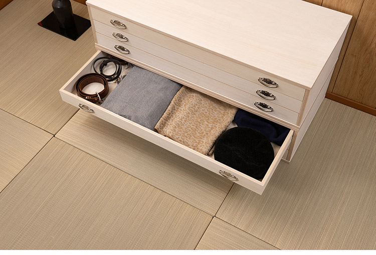 上置きタイプは重ね使用はもちろん単独直置きでも使用可能。着物から大切な衣類まで収納するならやっぱり桐。調湿機能に優れた桐材は、日本のように四季がある国では大変重宝されています。日本の伝統的な着物と桐箪笥は、まさに相性が抜群と言える組み合わせです。着物だけではなく、大事な衣類なども合わせて収納ができます。着物をたとう紙に入れたまま保管できるのが桐チェスト。もちろん、セーターや大事な衣類の保管にも。クローゼットや押し入れなどのデッドスペースに収納をプラスして。