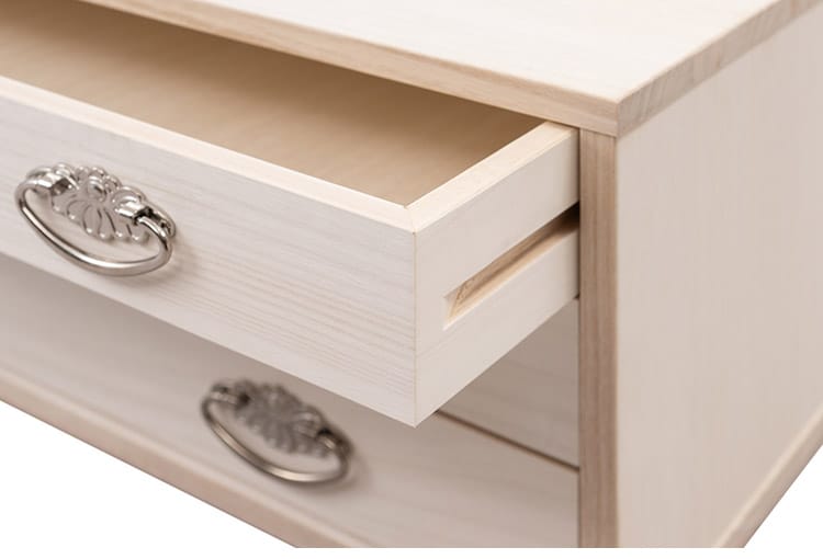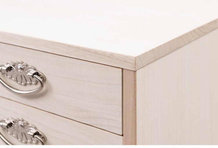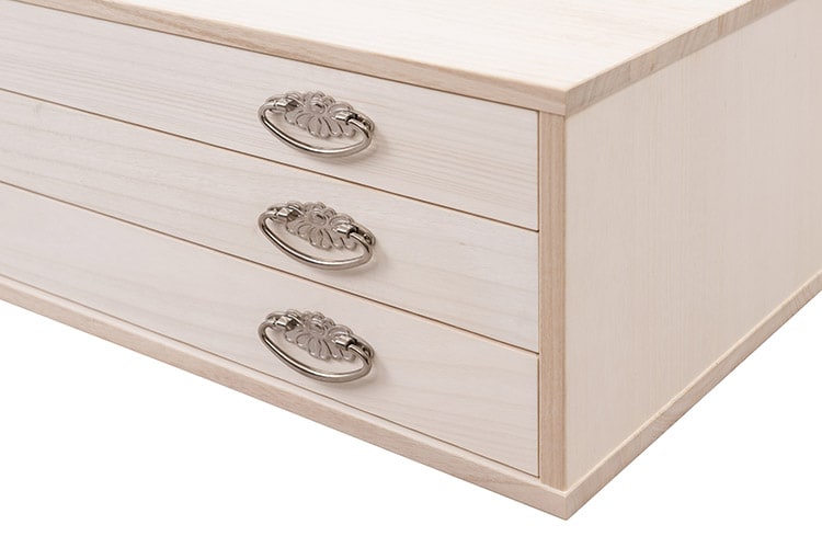 桐の素材を活かした生地仕上げ&華やかな輝きを魅せるシルバー金具。塗装は一切せず、桐の素材をそのまま活かした生地仕上げ。桐の香りが漂ってくるような感じと、お部屋が自然な空間に感じられます。