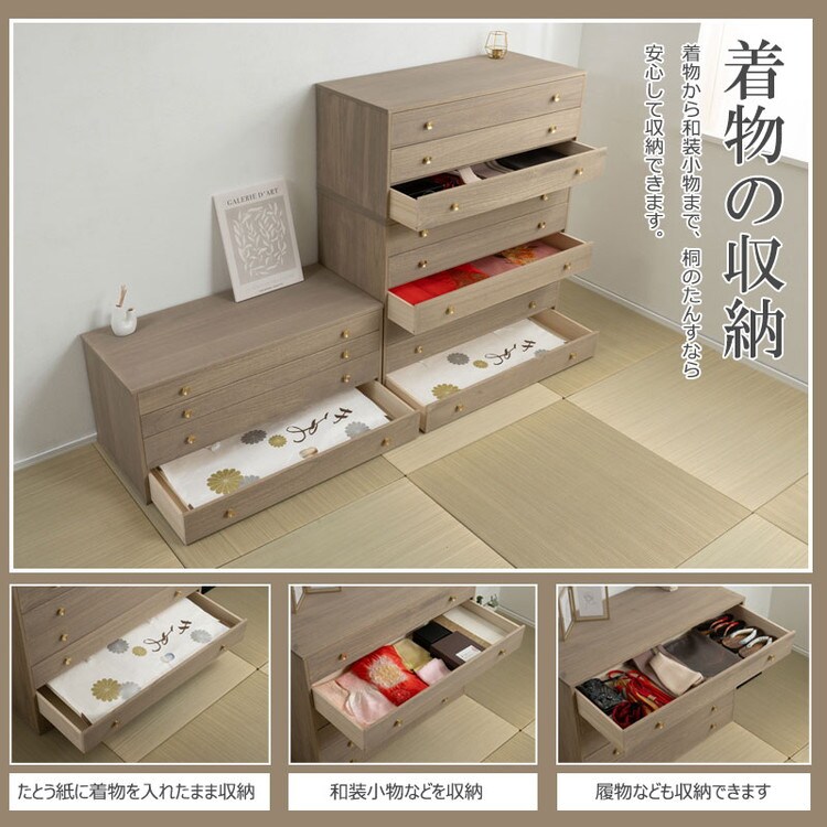 着物だけでなく大事な衣類の収納には本格的な桐の箪笥で保管を。良質な桐材を使用した桐チェストは、長めのたとう紙が入るワイドサイズで着物や洋服もたっぷり収納することができます。