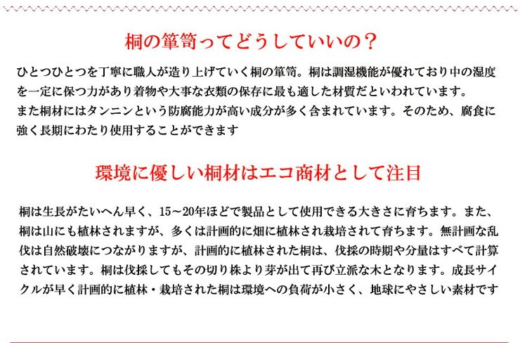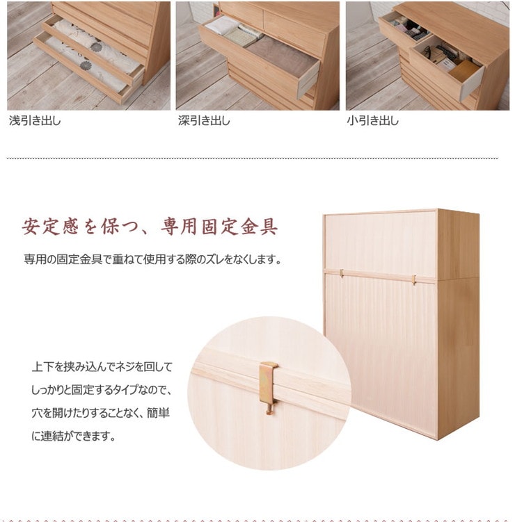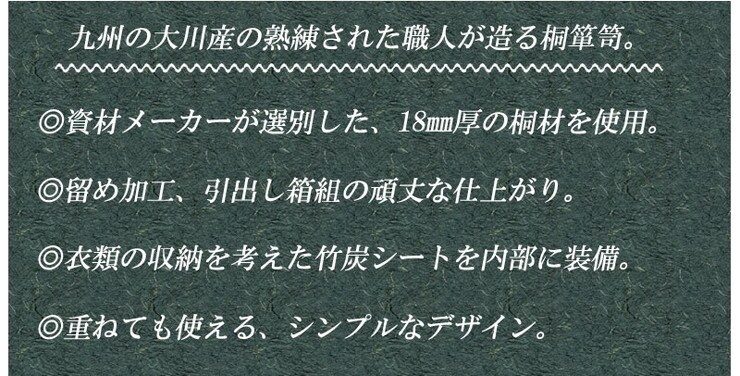 ■商品の仕様/本体:天然木桐材(水性塗装)、引出し底板・背板:天然木桐化粧板、背板内面:竹炭シート内蔵不織布