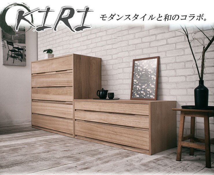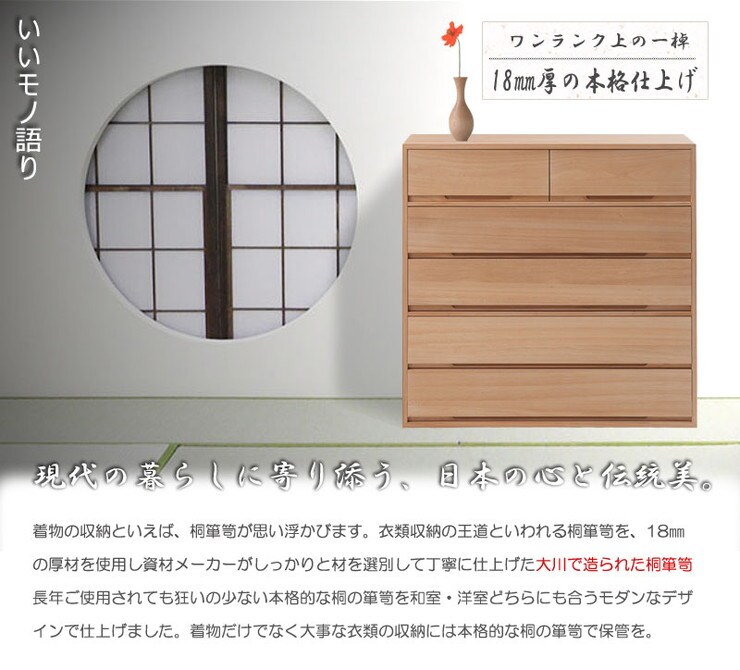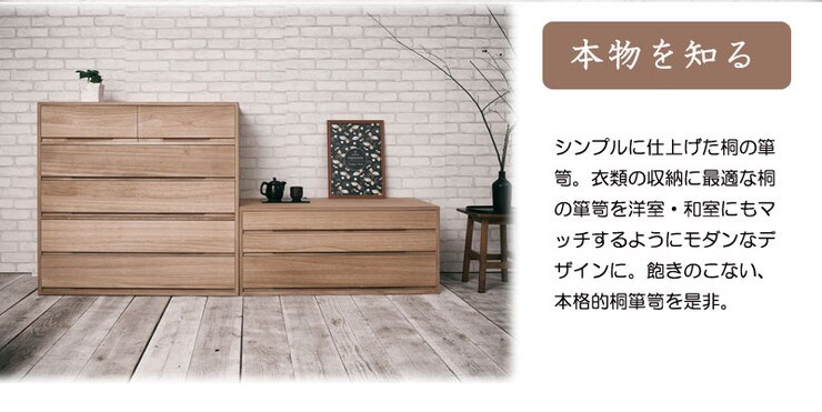 取っ手金物のないシンプルに仕上げたモダンな印象の桐箪笥。