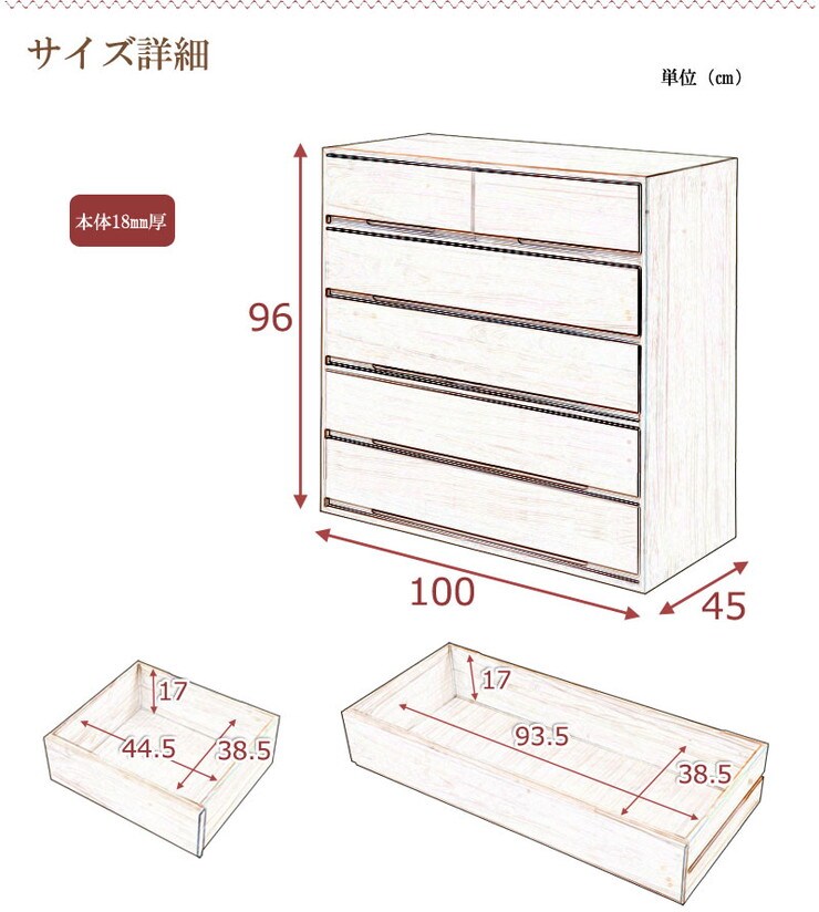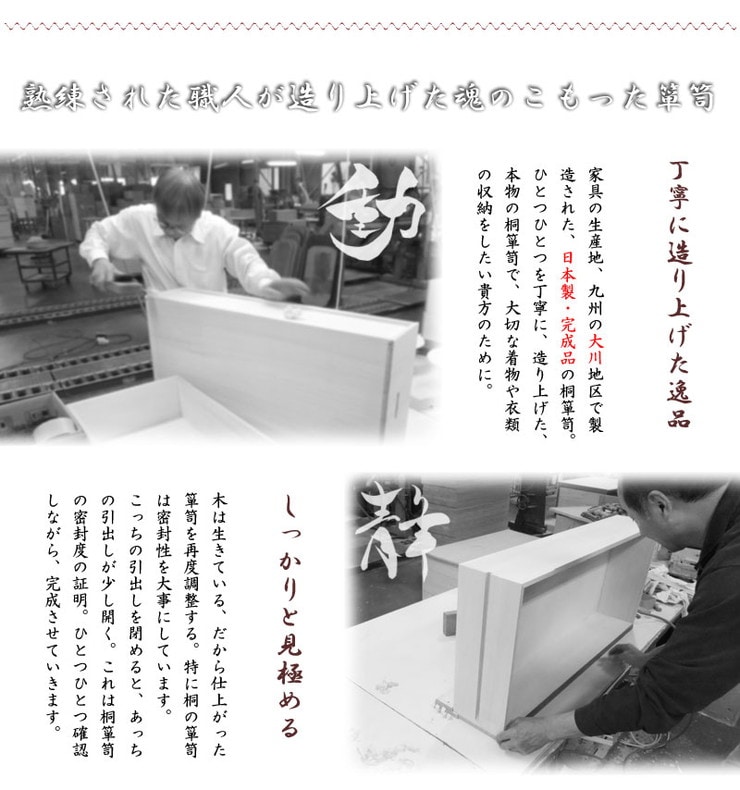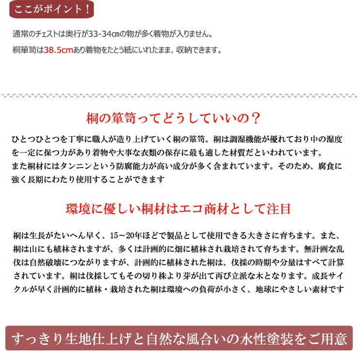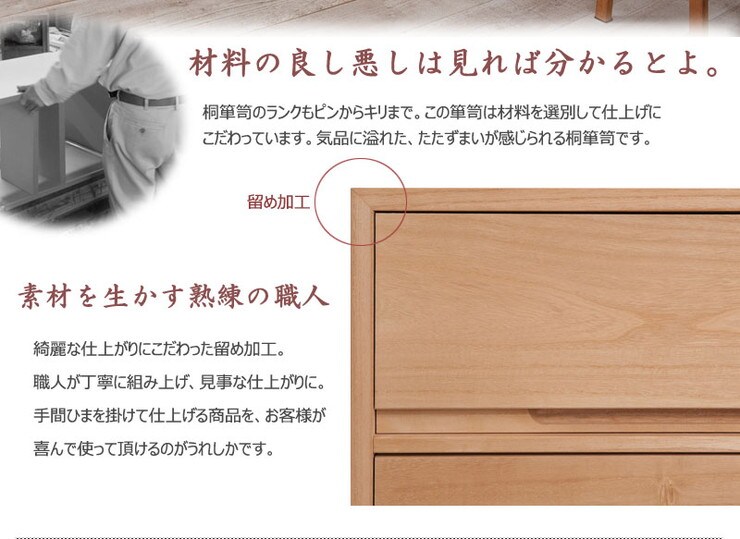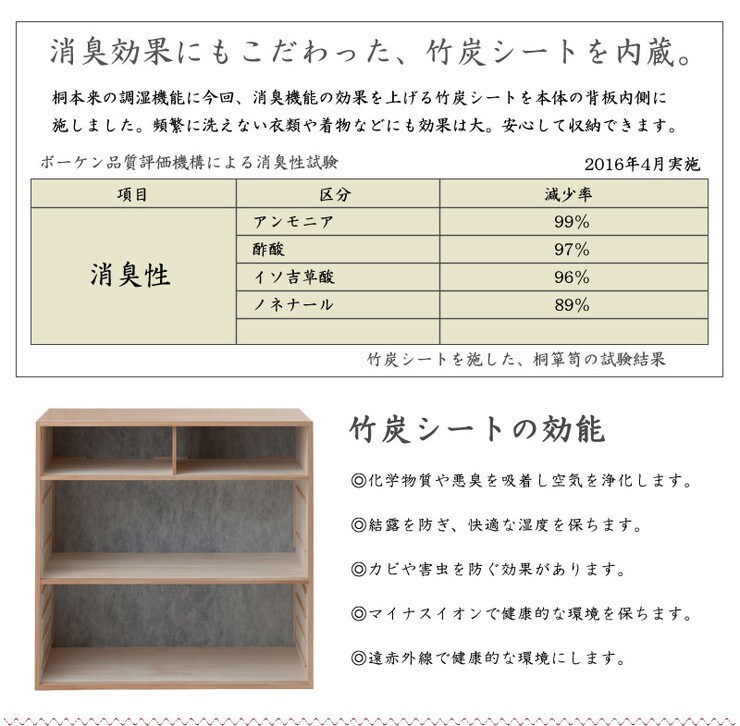 ■商品の仕様/本体:天然木桐材(水性塗装)、引出し底板・背板:天然木桐化粧板、背板内面:竹炭シート内蔵不織布