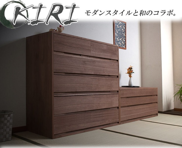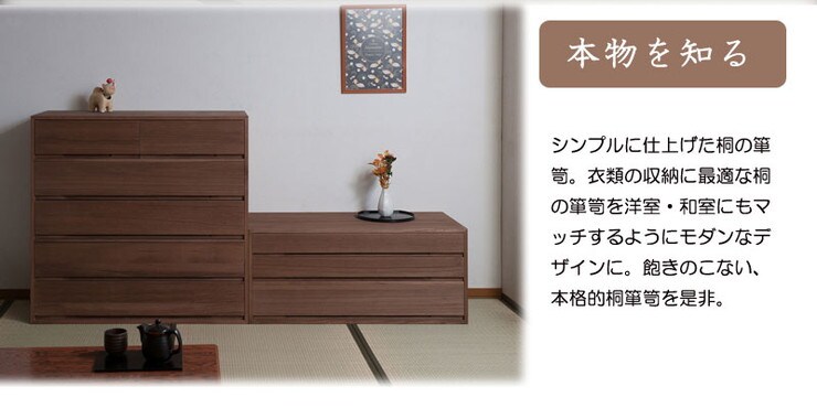 取っ手金物のないシンプルに仕上げたモダンな印象の桐箪笥。