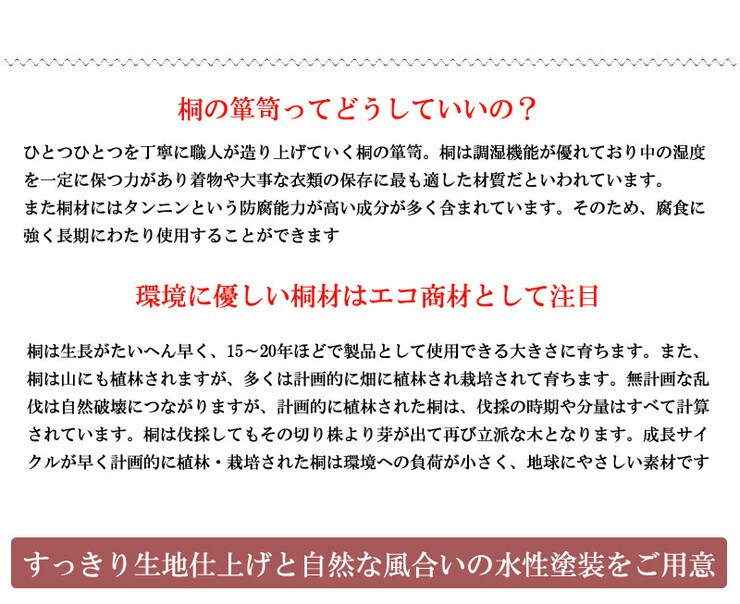 ■商品の仕様/本体:天然木桐材(水性塗装)、引出し底板・背板:天然木桐化粧板、背板内面:竹炭シート内蔵不織布