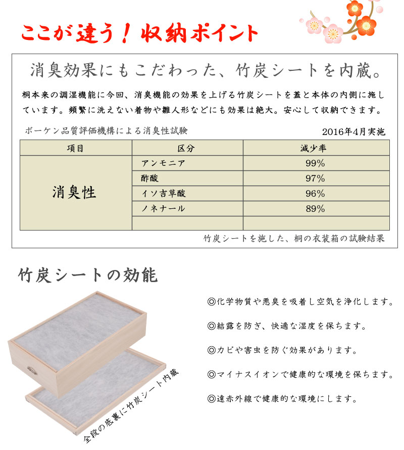 ■商品の仕様/本体:天然木(桐材)、天板・底板:天然木桐化粧板、蓋及び上2段裏面:竹炭シート内蔵不織布