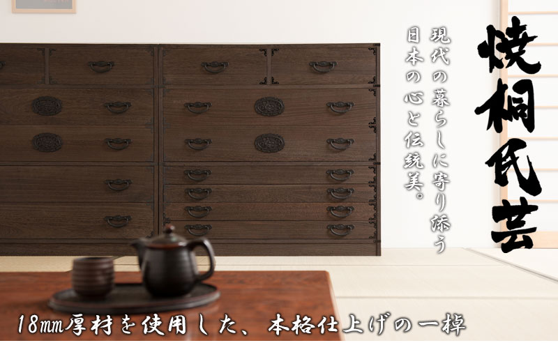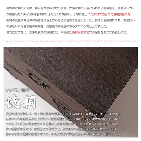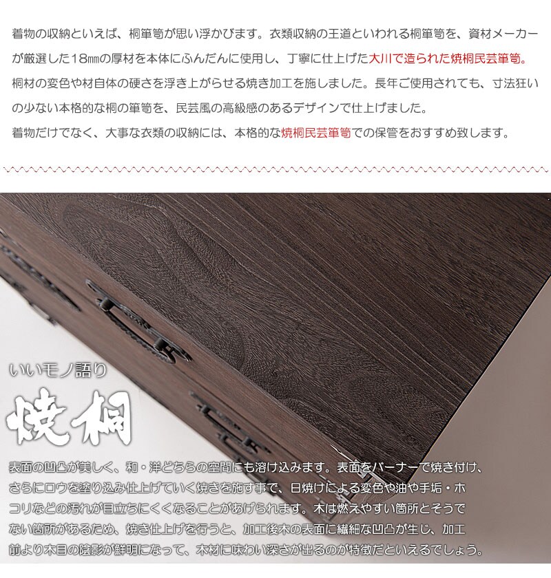 ■商品の仕様/本体:天然木桐材(焼き仕上げ)、引出し底板・背板:天然木桐化粧板、民芸金具:亜鉛ダイキャスト