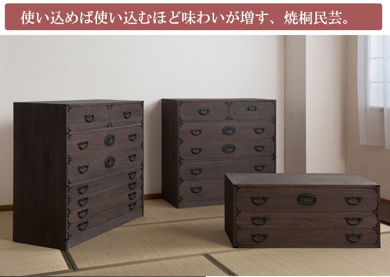 ■商品について/現代の暮らしに寄り添う日本の心と伝統美を落とし込んだ焼桐民芸箪笥【Jidai】時代シリーズ。表面をバーナーで焼き付け凹凸感を炙り出した重厚感ある仕上げ。マットブラックが光るどっしりとした装飾金物をあしらい個性をしっかりと演じています。3段・5段・7段をラインナップし重ねて使えば収納量はもちろん大迫力の存在感。桐材は内部を一定の湿度に保とうとする働きがあるので大事な着物や洋服などを湿気から守る桐箪笥にしまうのがベスト。その名の通り『時代』を超えて愛着の湧く飽きないデザインが魅力。
